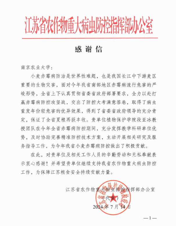 近日,江苏省农作物重大病虫防控指挥部办公室向南京农业大学发来感谢信,对博彩投注