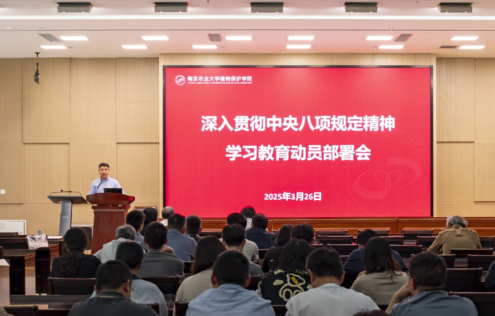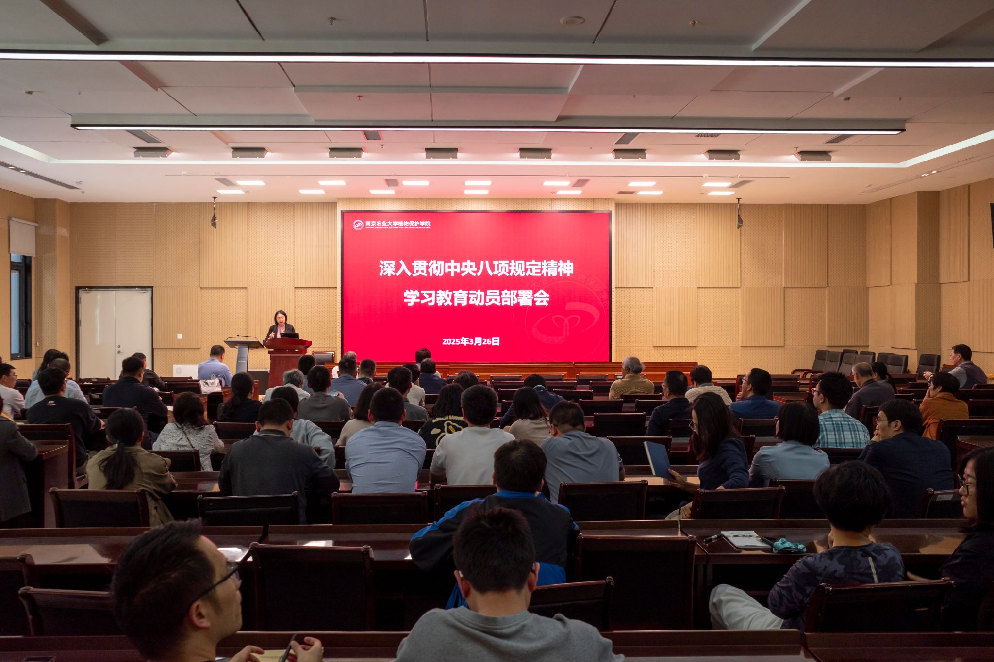 党委书记许承保传达了学校2025年全面从严治党工作会议暨巡视整改动员部署会会议精神和《中共南京农业大学委员会关于开展深入贯彻中央八项规定精神学习教育的实施方案》精神。根据党中央统一部署,学习教育于2025年全国“两会”后启动、7月底前基本结束,坚持聚焦主题、简约务实,不分批次、不划阶段,一体推进学查改,融入日常、抓在经常。