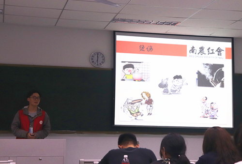 最后,杨雪详细介绍了有关“运动损伤”的知识,包括不慎扭伤,腰损伤时该如何应对。同时通过播放“海姆立克急救法”的视频,现场有请两位男生到台上演示,使同学们更加清楚异物卡喉的急救方法。
