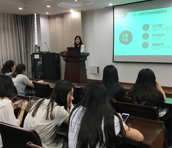 首先,汪越老师向同学们简单说明了大学生参加暑期社会实践的意义,从多个方面进行了分析;接着,汪越老师又向大家介绍了主要的社会实践类型,包括社区服务、科技务农、就业见习、志愿服务等,同时汪越老师从团队和个人两个方面重点讲解了如何进行社会实践以及社会实践报告的注意事项,汪越老师着重强调:社会实践注重真实,同学们提供的资料要能够展现实践过程。最后,汪越老师就社会实践的安全方面对在场同学进行了强调,并邀请学院组建的五个社会实践团队向大家一一介绍,方便同学们根据自身兴趣和能力选择活动。