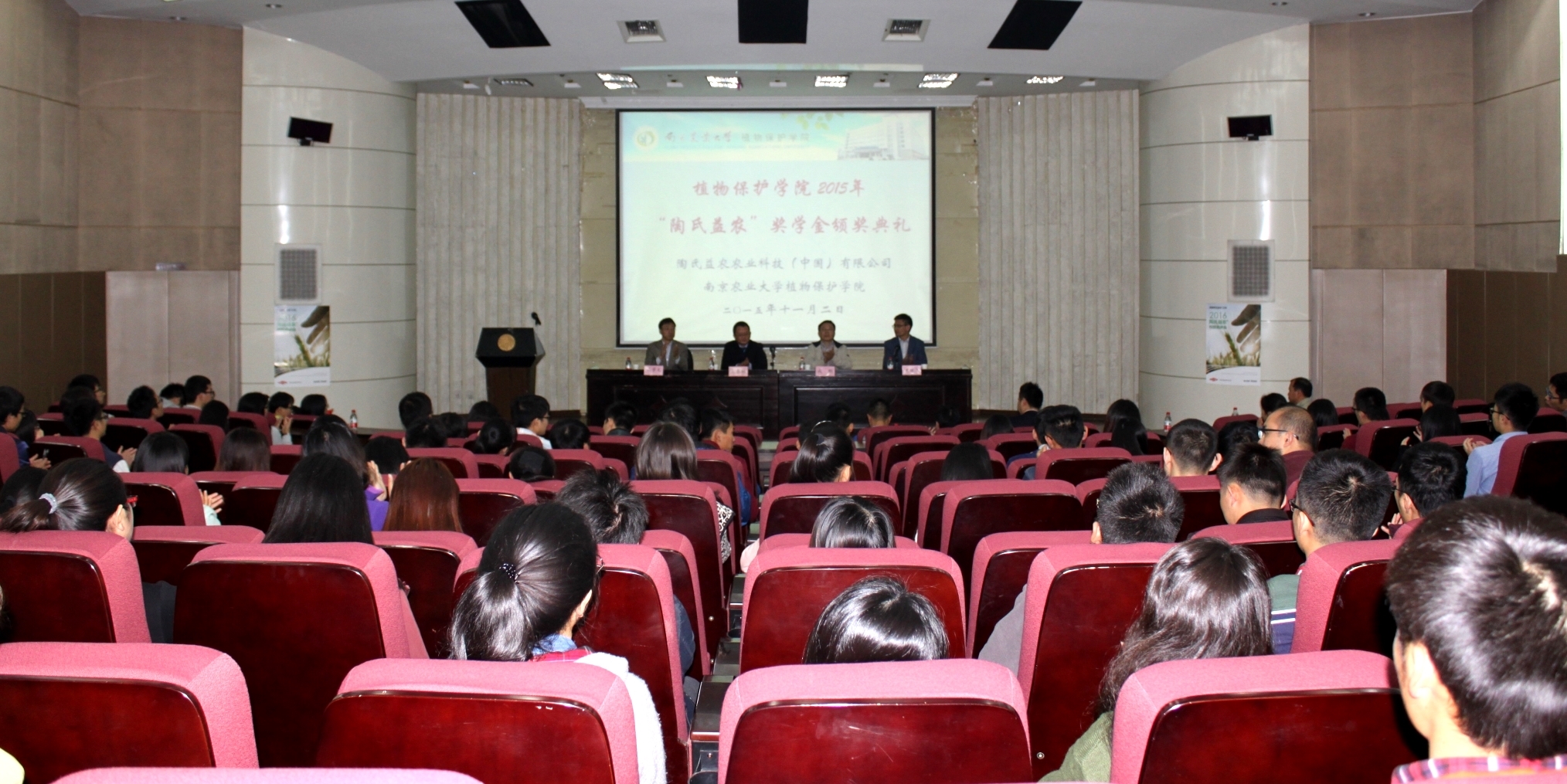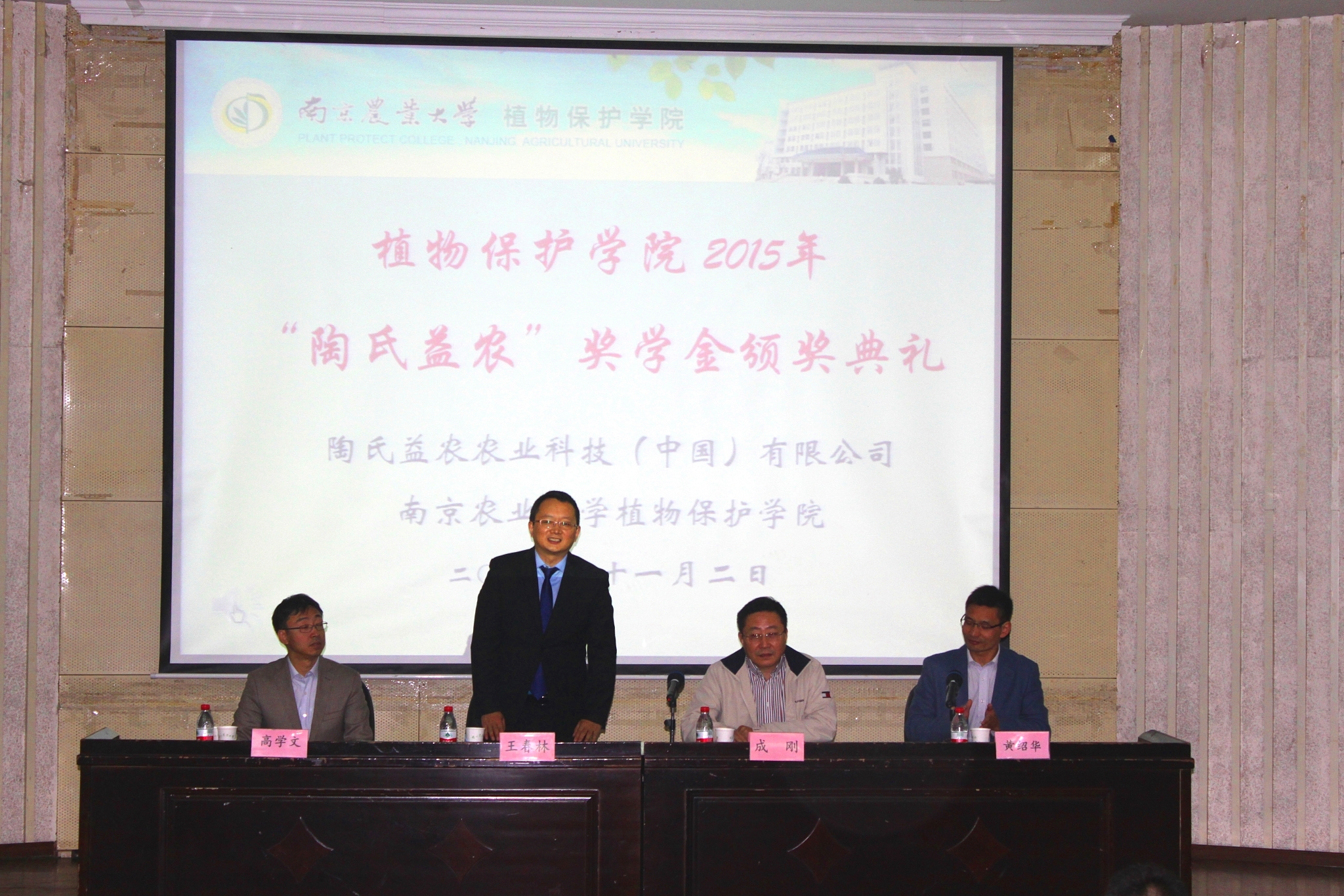 在图书馆报告厅举行陶氏益农奖学金颁奖典礼。陶氏益农大中华区技术传承总监王春林,陶氏益农江苏省销售经理成刚,博彩投注