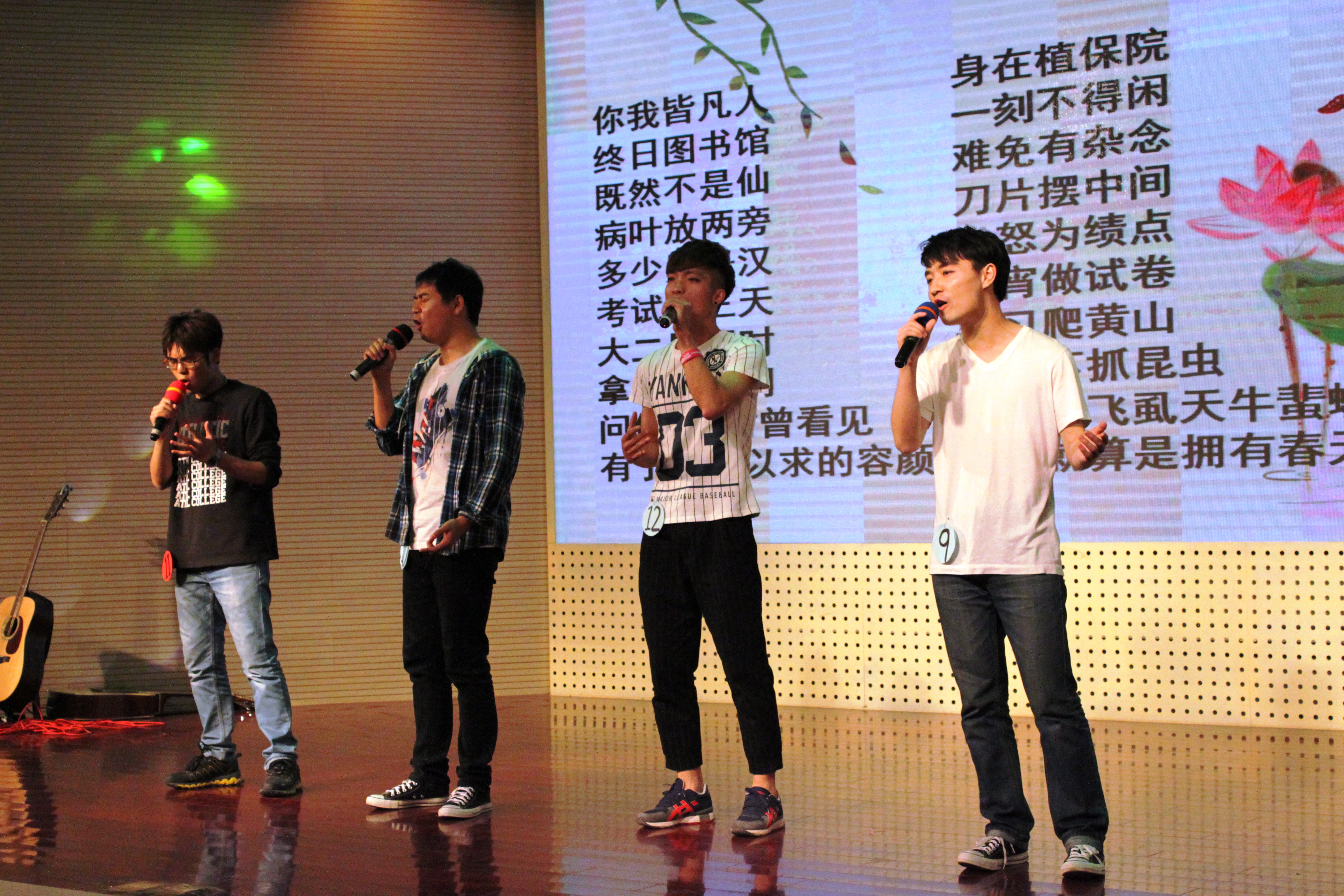 在同学们热情欢呼声中,一段充满青春活力的开场舞和由4位参赛选手一起倾情演唱的《植保歌》,正式拉开了本次大赛的帷幕。在主持人介绍完比赛规则后,第一轮比赛开始,十二位参赛选手两两分成六组,合唱一首经典歌曲,裁判举牌投票。10号选手孙毓璟和11号选手林帅的吉他弹唱《对面的女孩看过来》,以轻松愉快的曲调赢得了全场观众的掌声,最后林帅以更好的发挥成功晋级。12号杨国晴与3号张霁初合唱的《浮夸》以高超的技巧赢得评委的一致好评,杨国晴以超强的舞台表现力也成功进入最后一轮。第一轮结束,6人进入待定区。