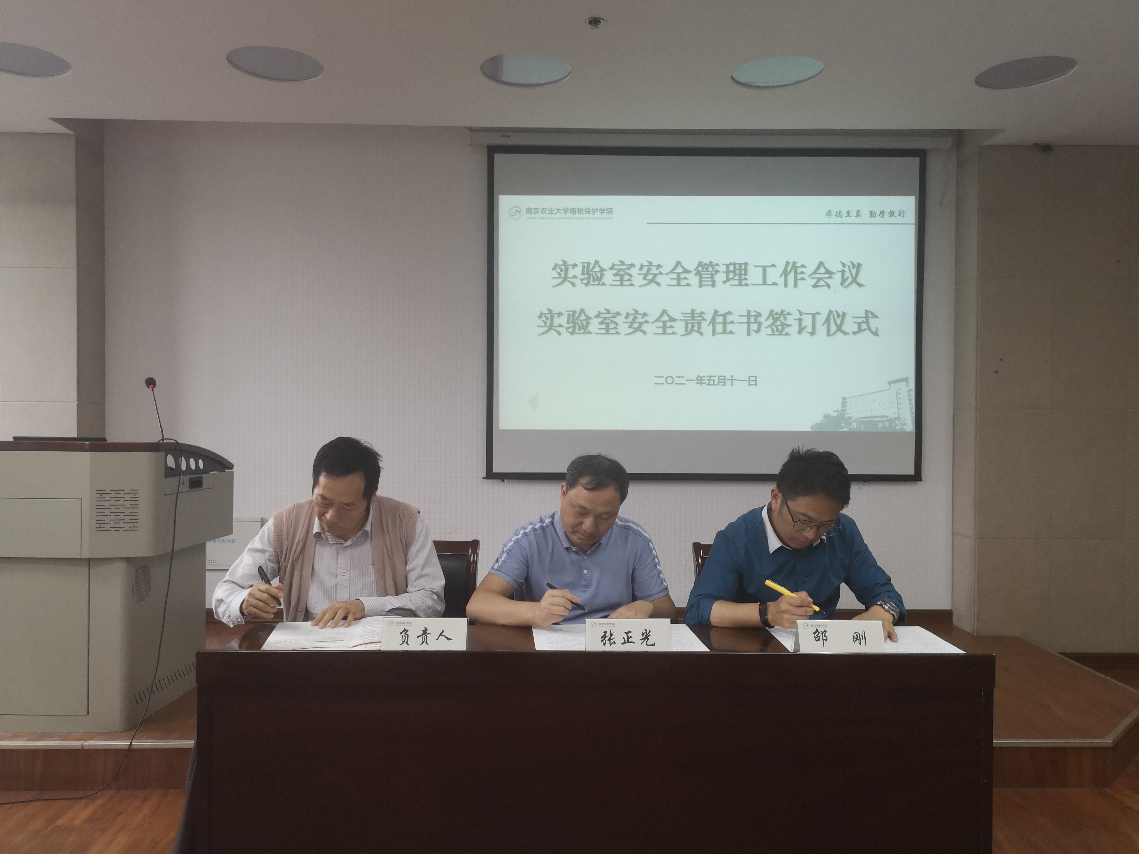 学院的党政负责人张正光院长和邵刚书记代表学院与各实验室的负责人签订了实验室安全管理责任书。会上,张院长强调,学院一直以来高度重视实验室安全工作,希望各个实验室切实加强安全检查,把工作落实落细,积极创造安全的教学、科研环境。