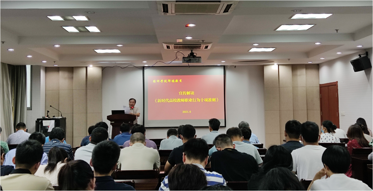 张正光详细解读了《新时代高校教师职业行为十项准则》,他强调师德师风建设的重要意义,要坚持把师德师风作为评价教师队伍素质的第一标准,提醒与会教职工遵守准则,提高政治站位,守好政治规矩和纪律,严守科研学术道德规范,教书育人培育好学生。