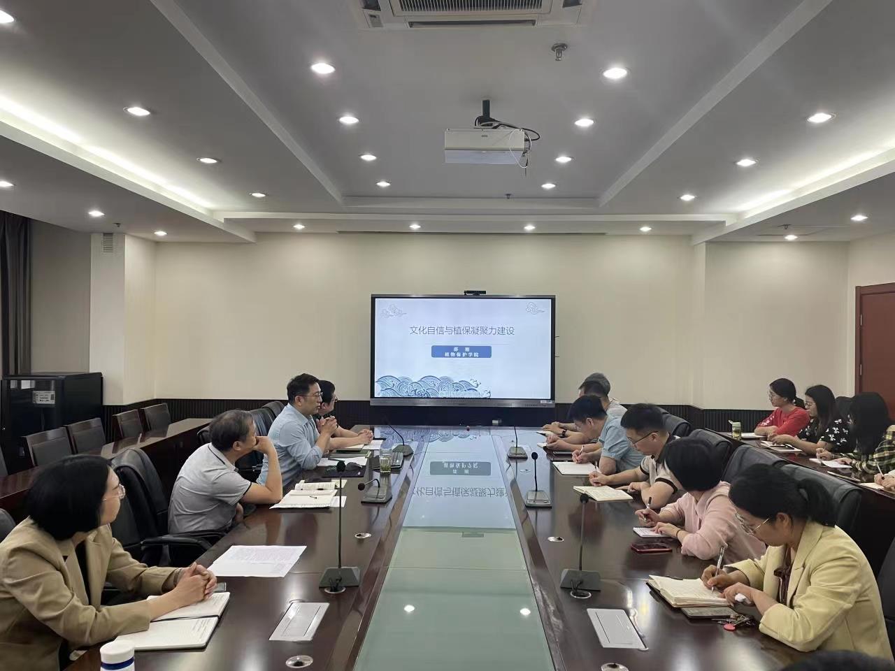 邵刚作题为《文化自信与植保凝聚力建设》专题报告。报告系统介绍了习近平总书记对中国特色社会主义的文化建构,从“三个自信”到“四个自信”,从“一个结合”到“两个结合”,从“坚定文化自信”到“推进文化自信自强”的发展历程。报告介绍了中华传统文化的核心内涵,与文化自信的内在关系以及社会主义核心价值观的形成过程与内容等。他表示,要通过文化自信自强来提升植保凝聚力。学院要充分发挥植保百年历史的荣光,深度挖掘植保“厚德至真、勤学敦学”的文化精神,大力弘扬建设世界一流植保学科的美好愿景,不断完善学院治理体系,提升治理能力,提高植保师生幸福感。