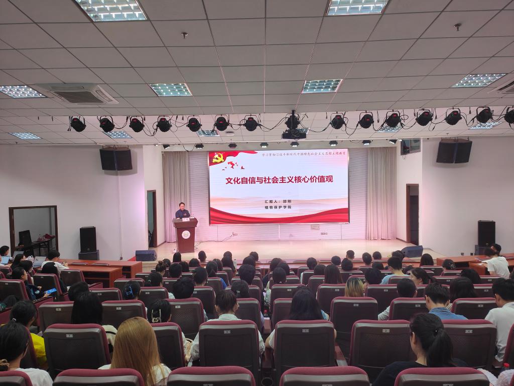 党委书记邵刚为学院党员师生讲授《文化自信与社会主义核心价值观》专题党课。他以身边的文化现象引导大家思考文化与价值观、文化与国家的关系。他介绍了习近平总书记对中国特色社会主义的文化建构,从“三个自信”到“四个自信”,从“一个结合”到“两个结合”,从“坚定文化自信”到“推进文化自信自强”的发展历程。报告以翔实的文史资料、鲜活的文化素材阐述了中华传统文化的发展历程、革命文化和社会主义先进文化的形成过程,及社会主义核心价值观的丰富内涵,引导大家深刻认识中华优秀传统文化提供的价值观意义,大力弘扬伟大建党精神、深入宣传中国共产党人精神谱系,激励大家建立理性与文化自觉、注重文化自信中的意识形态建设,强调牢牢坚持党在先进文化制度建设中的领导。他鼓励大家多读文史哲作品,寻求内心的真善美,用科学武装人生、用信仰坚定人生、用哲学智慧人生、用艺术美丽人生、用历史积累人生,实现自我的发展与价值的实现。