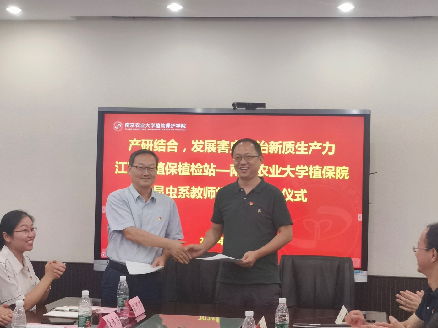 院长张正光,江苏省植保植检站站长、党支部书记田子华,王茂涛和杨荣民副站长等相关领导,以及双方党支部全体党员均出席了本次共建仪式。许承保首先致欢迎辞,对双方的合作表示热烈欢迎和高度评价。随后,双方党支部代表分别介绍了各自党支部建设的情况,近些年在党建与业务双融合方面取得的有效成果和进展。交流座谈环节中,双方就如何加强产研结合、促进害虫防治技术革新等议题进行了深入探讨,江苏省植保植检站的专家们汇报了近些年进行害虫防治的实践经验与存在的挑战。南京农业大学教师团队则从学术研究角度,分享了他们在害虫监测预警以及绿色防控技术等方面的最新研究成果。同时,双方探讨了如何将这些研究成果更好地应用于实际生产中以及未来可能的合作方向。