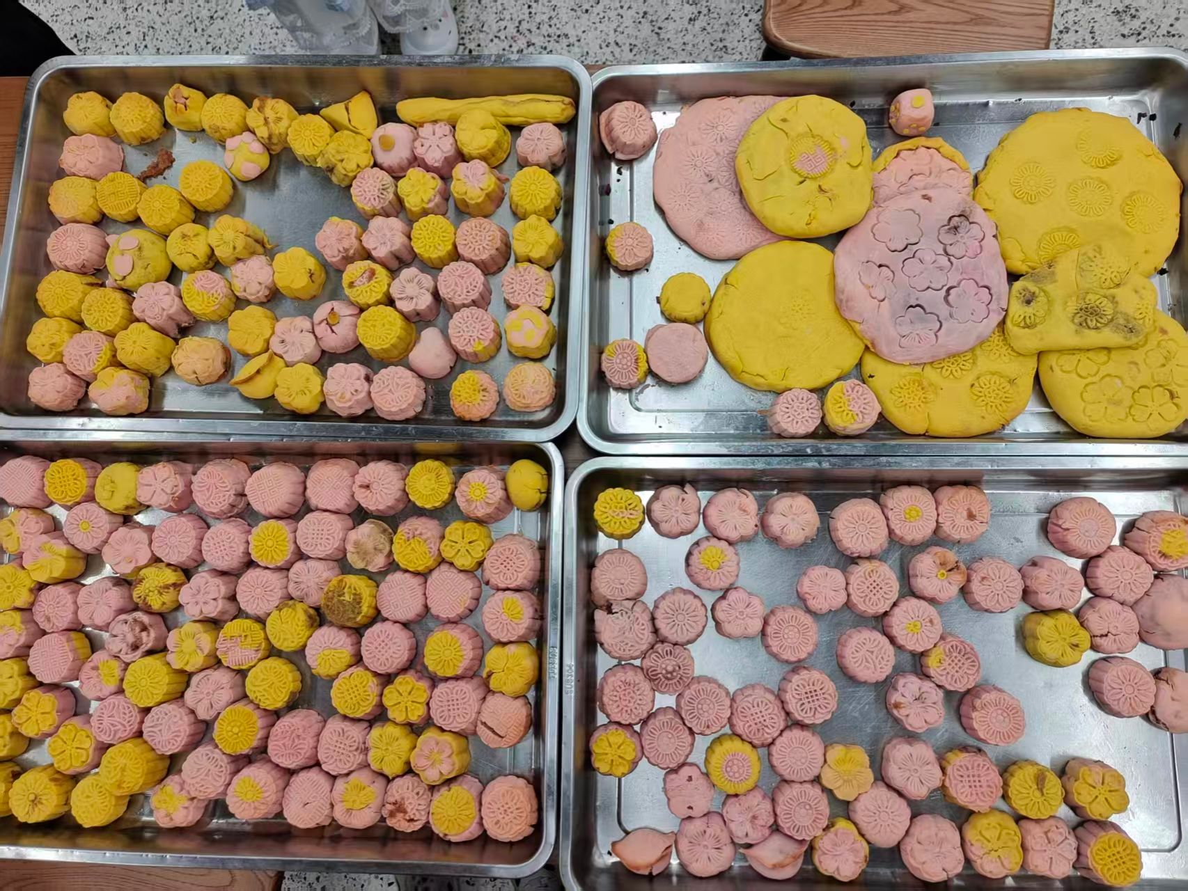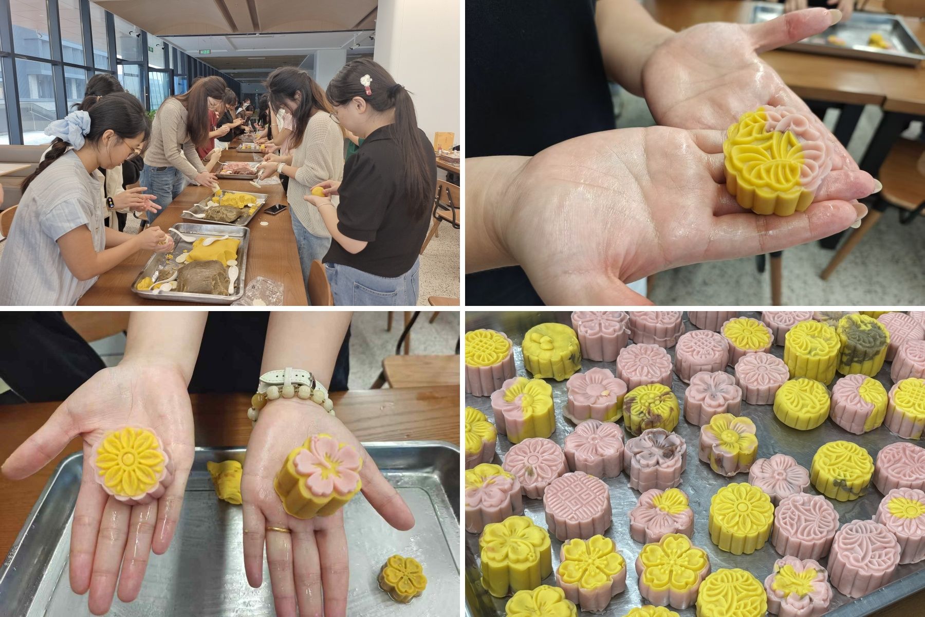 随后,是月饼制作环节,大家将一个个面皮在手心轻压成薄片,放入不同口味的馅料,并慢慢收口。经过模具的按压,一个精美的月饼便呈现出来。大家热情洋溢,说笑间,既能够制作标致的月饼,也能实践自己的月饼创意。最后在大家的共同努力下共制作了将近300个月饼,为中秋佳节添上一笔圆满的回忆。