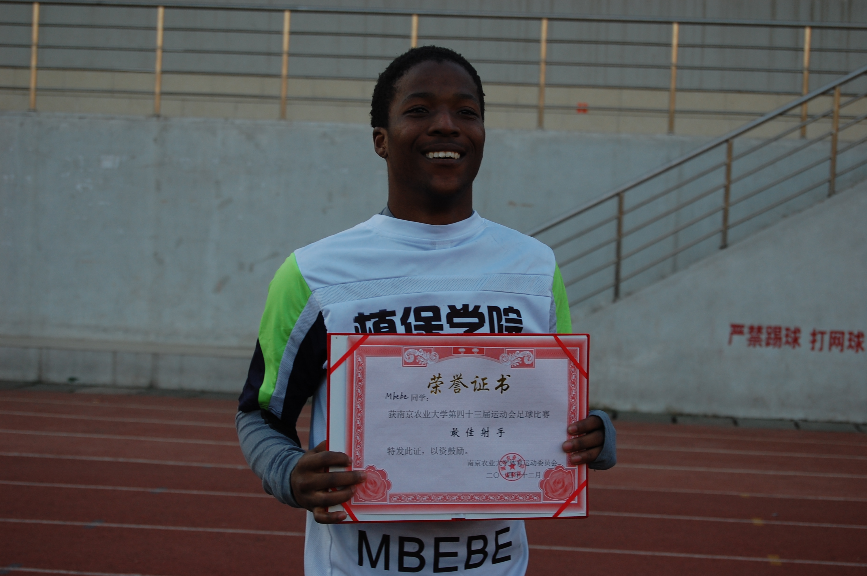 球员Mbebe获"最佳射手"的荣誉称号。院系杯足球赛已告一段落,比赛虽已结束,可足球还在继续,球员之间的情谊还在继续,博彩投注