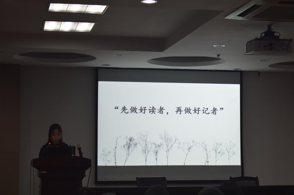 张伊杰首先向同学们介绍了什么是新闻及新闻的特点和体裁,着重介绍了消息的内容要素和标题、导语、主体、背景、结语等五个组成部分及特点。张伊杰讲到,标题应力求言简意明、富有吸引力;主体作为新闻稿的主要部分,要求主干突出、层次分明。结语是消息的最后一段,阐明所述事实的意义,帮助读者增进理解并获得更多启示。校园新闻体裁以消息为主,她还对校园新闻写作中可能出现的错误进行了提醒。培训会最后,张伊杰以“先做好读者,再做好记者”为结语,总结了本次培训。
