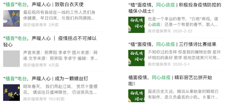 筑牢阵地,媒体宣传共聚力。在学院微信平台“南农植保青年”开辟“植”面疫情,同心战“疫”、“植音”电台,声暖人心、鼠你健康专栏,做好疫情防控网络宣传,加强舆论引导。累计发布推送50余条,总阅读量超过17000次,获微信平台“南京农业大学”报道1次,“南农青年”报道1次,营造了科学防控、共抗疫情的良好舆论氛围。