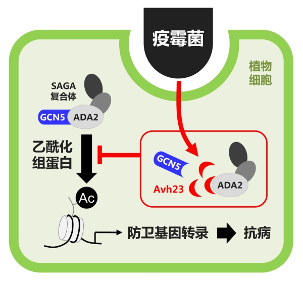 组蛋白修饰(Histone modification)是生物体表观遗传修饰的一种重要方式,通过影响基因表达、染色质重塑等过程广泛参与生物体的生长、发育及免疫等方面。本研究发现大豆疫霉分泌的效应蛋白Avh23能够进入到大豆细胞内,通过竞争性结合组蛋白乙酰化修饰复合体SAGA的ADA2亚基,抑制催化亚基GCN5的作用,进而抑制大豆体内的乙酰化修饰水平,使一系列防卫相关基因的表达水平降低,导致大豆对疫霉菌的抗病性显著下降。该研究阐明了病原菌在表观修饰水平上调控寄主免疫反应的一种新机制,也揭示了大豆抗病性状中易被病原菌攻击的“阿克琉斯之踵”。该研究探明的大豆抗病性状新靶点,有望为农作物抗病性的改良提供重要依据。