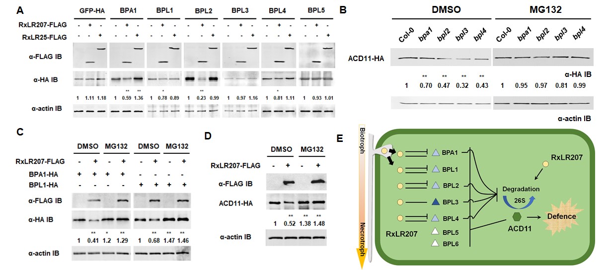 以往的研究表明,作物受疫霉菌感染后,就像人类的感冒发烧一样,会激发免疫反应,用自身的免疫力杀死病菌。南京农业大学作物疫病研究团队近年来对辣椒疫霉菌进行了系统地研究,精确定位到它的一个致病关键成员,即效应子RxLR207。研究人员以辣椒疫霉菌的一种寄主模式植物拟南芥为研究对象,通过靶标筛选,发现RxLR207直接作用于拟南芥中的一组未知功能蛋白,研究显示这组蛋白与一个植物免疫系统的重要调控因子ACD11 (accelerated cell death11)互作,故将其命名为BPA1 (binding partner of ACD11)和BPLs (BPA1 Like proteins)。