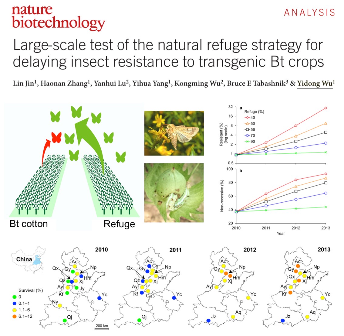 吴益东教授课题组在棉铃虫对Bt棉花抗性研究方面取得重要进展。12月15日,国际权威刊物《Nature Biotechnology》(IF=39.1)在线发表了题为“Large-scale test of the natural refuge strategy for delaying insect resistance to transgenic Bt crops”的相关研究成果,这是该课题组继2012年揭示棉铃虫田间种群Bt抗性遗传多样性(PNAS)之后的又一重要进展。博士研究生金琳为该论文第一作者,吴益东教授为通讯作者。