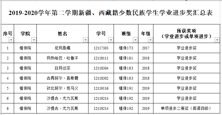 经学生申请、材料审核,现将2019-2020学年第二学期新疆、西藏籍少数民族学生学业进步奖评定结果公示如下:
