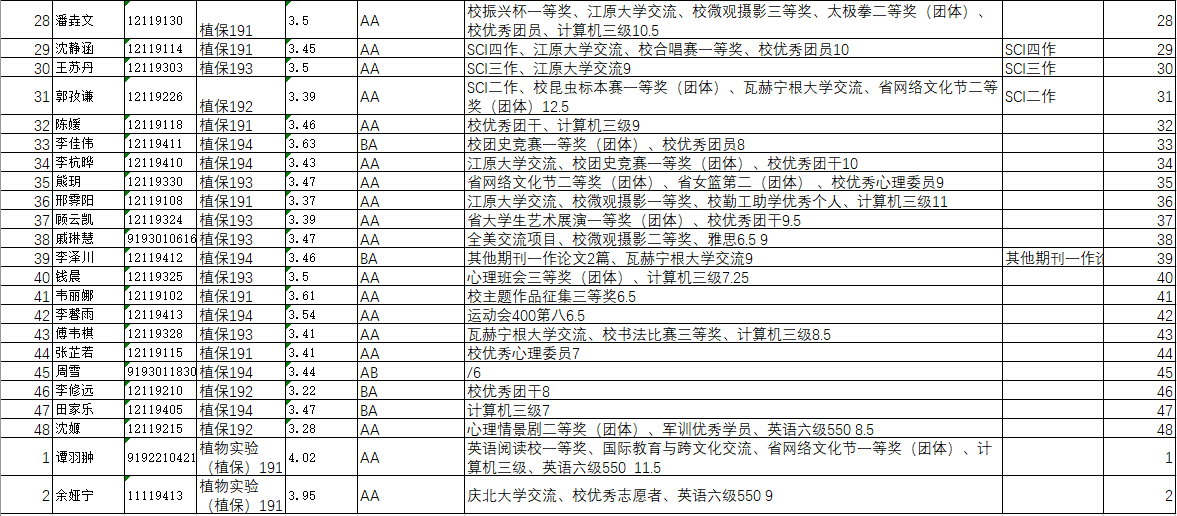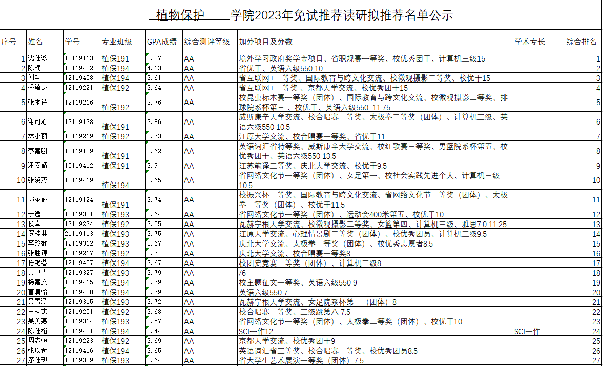 根据《南京农业大学关于做好2023年推荐优秀应届本科毕业生免试攻读研究生推荐工作的通知》文件精神,经学生自愿申请,学院初步审核以及资格认定答辩,依据《博彩投注 2023年推荐免试研究生(含“直博生”)工作方案》综合排名,现将最终拟推荐名单公示如下(按综合成绩排名排序):